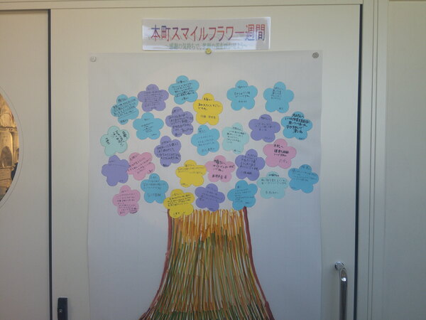 本校では、12月1日(月)~5日(金)を人権教育週間としています。そのため、子どもたちには「感謝の気持ちで、笑顔の花を咲かせよう」と呼びかけ、写真のような「本町スマイルフラワー週間」として、友達への感謝の気持ちを書いたお花を掲示しています。