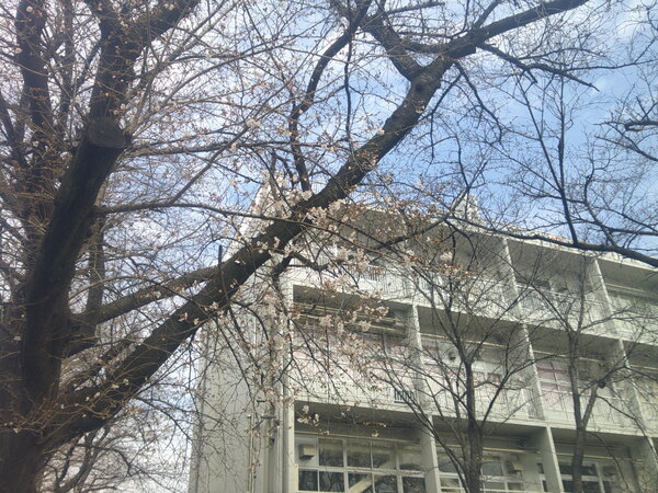 3月23日(月)に、南校舎横の桜の木に花が咲いているのを見つけました。明日(24日(火))の卒業式に合わせて咲いてくれたように思います。卒業生の門出がさらに、素晴らしいものとなりそうです。